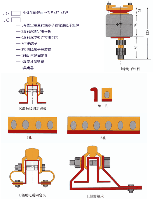 JGH-II型剛體滑觸線由梯型銅棒和槽鋼或由“T”型銅排和槽型鋁結合及由燕尾槽銅棒和高鋼度工字鋼相構成。剛體滑觸線用高強度專用絕緣子作支撐,從而組成向各種起重機械設備饋電的移動滑觸線。